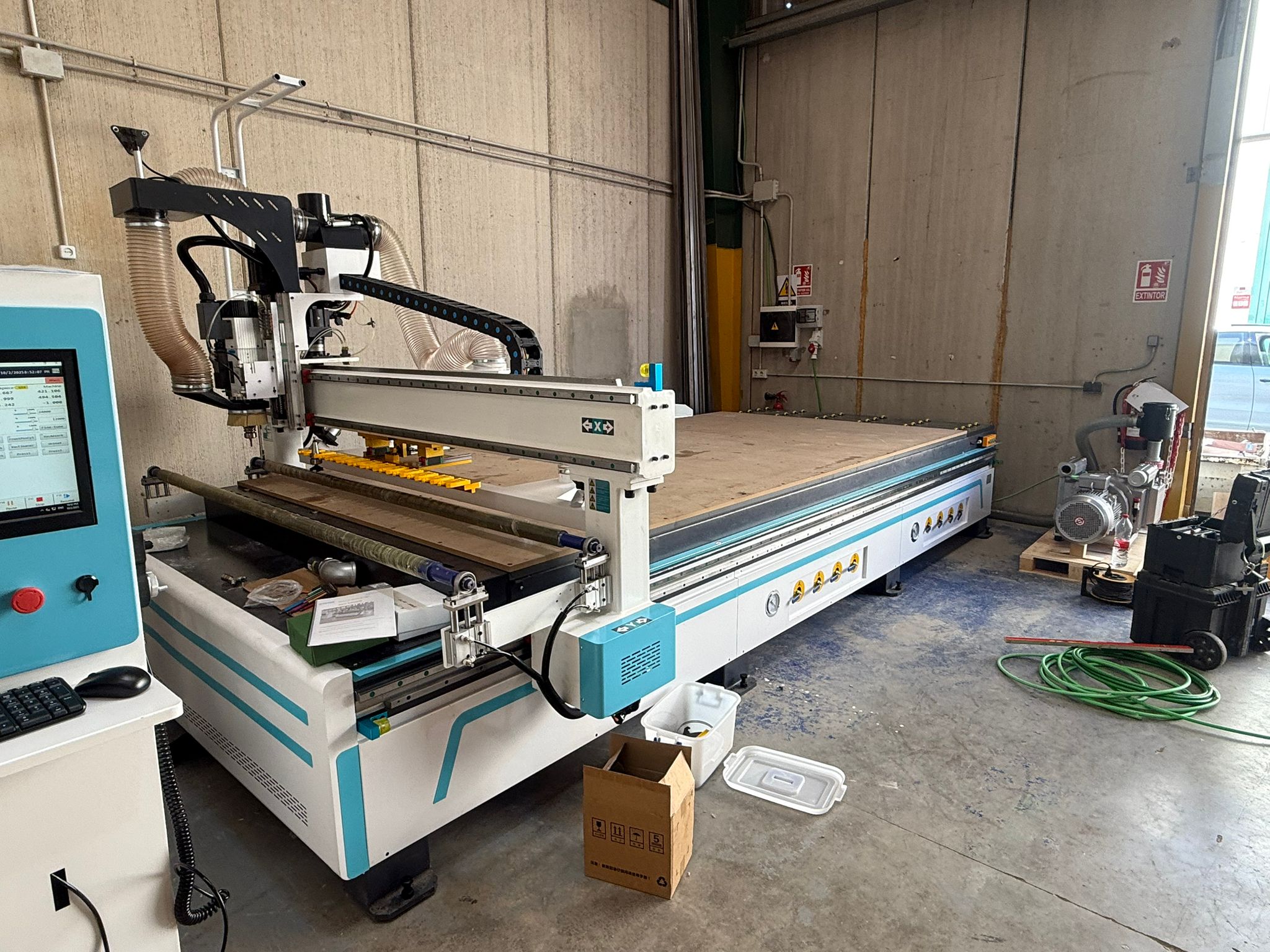 CNC Nesting, campo trabajo 4080x2080x100mm, 12 herramientas en cargador, fresador 9Kw, Bomba de vacio sin aceite 7,5Kw, rodillos de presión, medidor automático herramientas.Máquinas totalmente personalizables a las necesidades del cliente desde 27.000€, con marcado CE